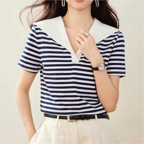 세일러 카라 반팔티 스트라이프 블라우스 여름 티셔츠 WFKZVOX