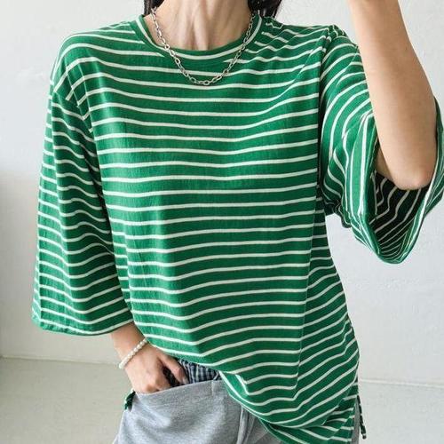 [셀러허브_여성트랜드패션]여자 힙커버 사이드슬릿 쭉 줄무늬 칠부 티셔츠