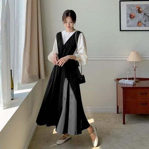 [셀럽하우스]브이넥 XKDQ8292 리본 스트랩 롱기장 레이어드 원피스 3컬러