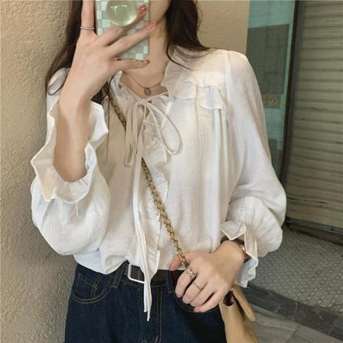[엄지척]흰색 블라우스 프릴 러플 스트링 카라 포인트 셔츠_19650001_667501