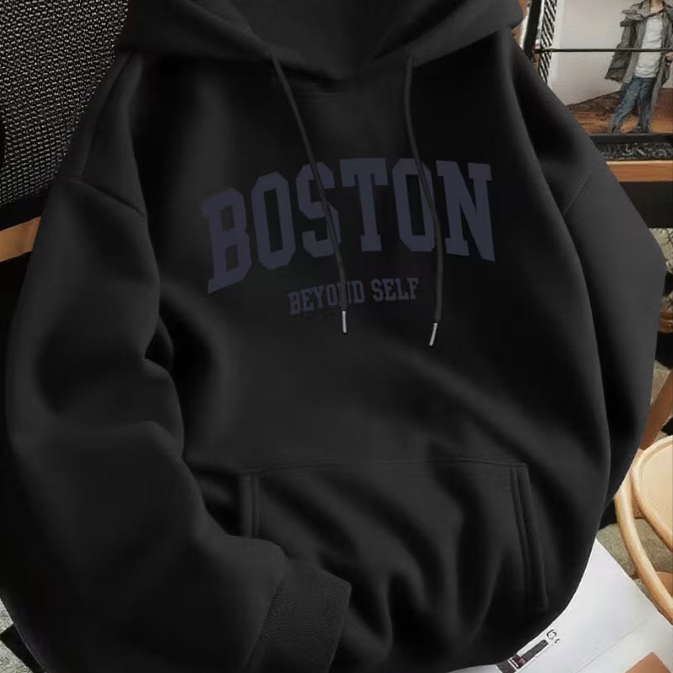 TEMU 남성용 보스턴 레터 고급 멀티 레트로 프린팅 후드티 레귤러 버전, 후드 칼라 스타일, 솔리드 컬러와 그래픽 프린팅 매치, 캐주얼 긴팔 풀오버