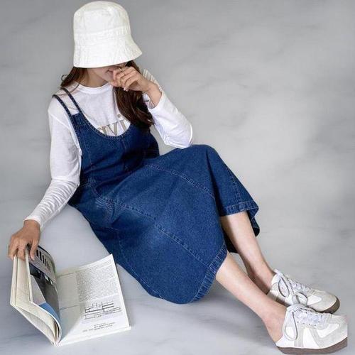 [옷자락]여성 중청색 포켓 이중 스트랩 청멜빵 롱 드레스