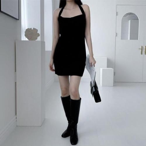 여자 H라인 민소매 목 폴라 스판 미니 짧은 원피스