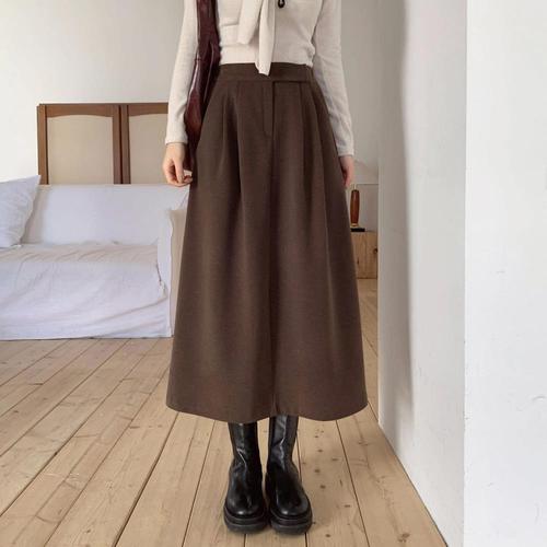옷자락 / 여자 겨울 스판 핀턱 스웨이드 플레어 롱 치마 스커트