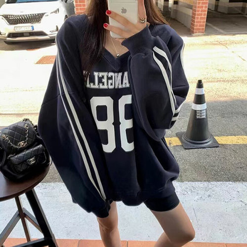 [신상오픈런]여자 브이넥 스포티 박시 배색 레터링 스트링 맨투맨