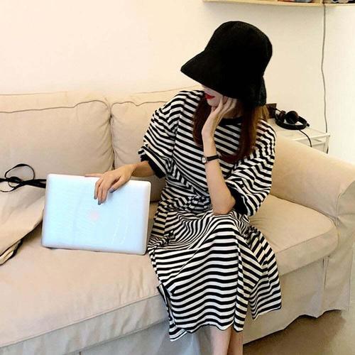 캐주얼 줄무늬 스프라이트 반팔 롱 원피스 오버핏원피스