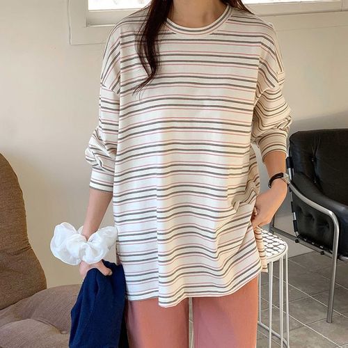 오스틱니 2026 신상 초특가 여성용 봄가을 스트라이프 루즈핏 데일리룩 라운드 긴팔 티셔츠