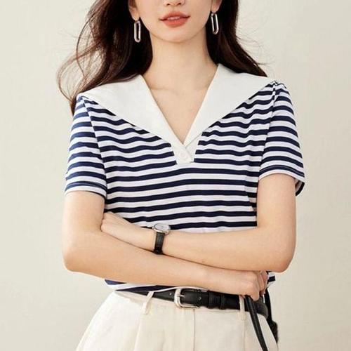 [에이치플러스몰]세일러카라 단가라 반팔티 여성 여름 스트라이프티