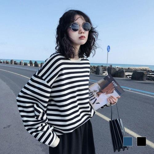 로루아 빅사이즈 여성 스트라이프 심플 라운드 맨투맨 긴팔 티셔츠