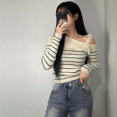 [셀럽하우스]여성 TGPI4524 스프라이트 오프 원 숄더 언발 리본 니트 티