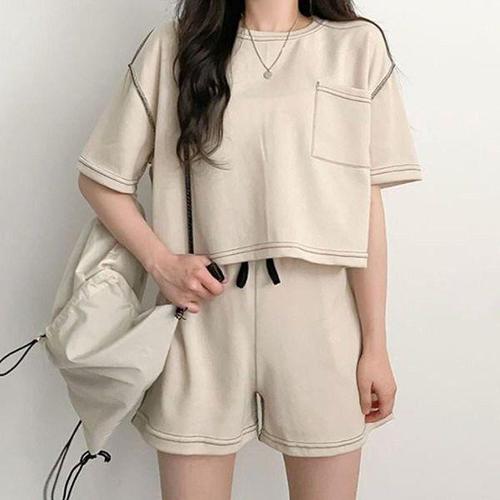 [에이치플러스몰]여성 반팔 반바지 스티치 디자인 여름 셋업 LKSS34 슬림핏 라운드 레터링 사