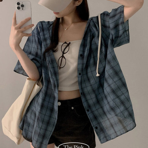 더핑크 / 코미 체크 시스루 후드 반팔 셔츠