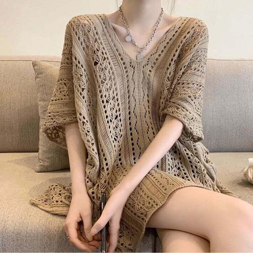 [셀럽하우스]여성 MNUI3115 그물니트 여름 브이넥 오버핏 시스루 커버업