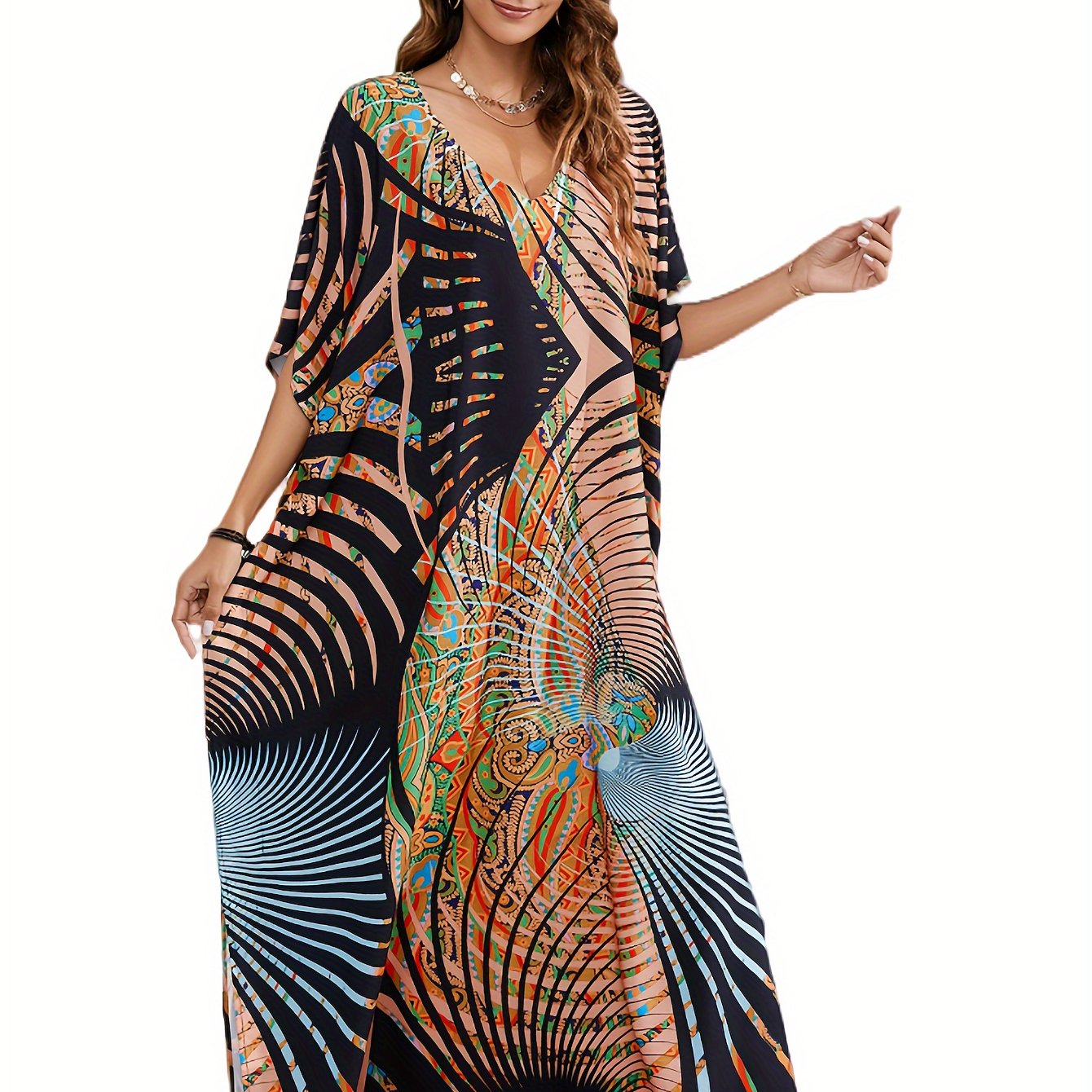TEMU 프린트 비치 커버업 드레스, 롱 로브 스타일 캐주얼 바캉스 드레스, 비키니 커버업