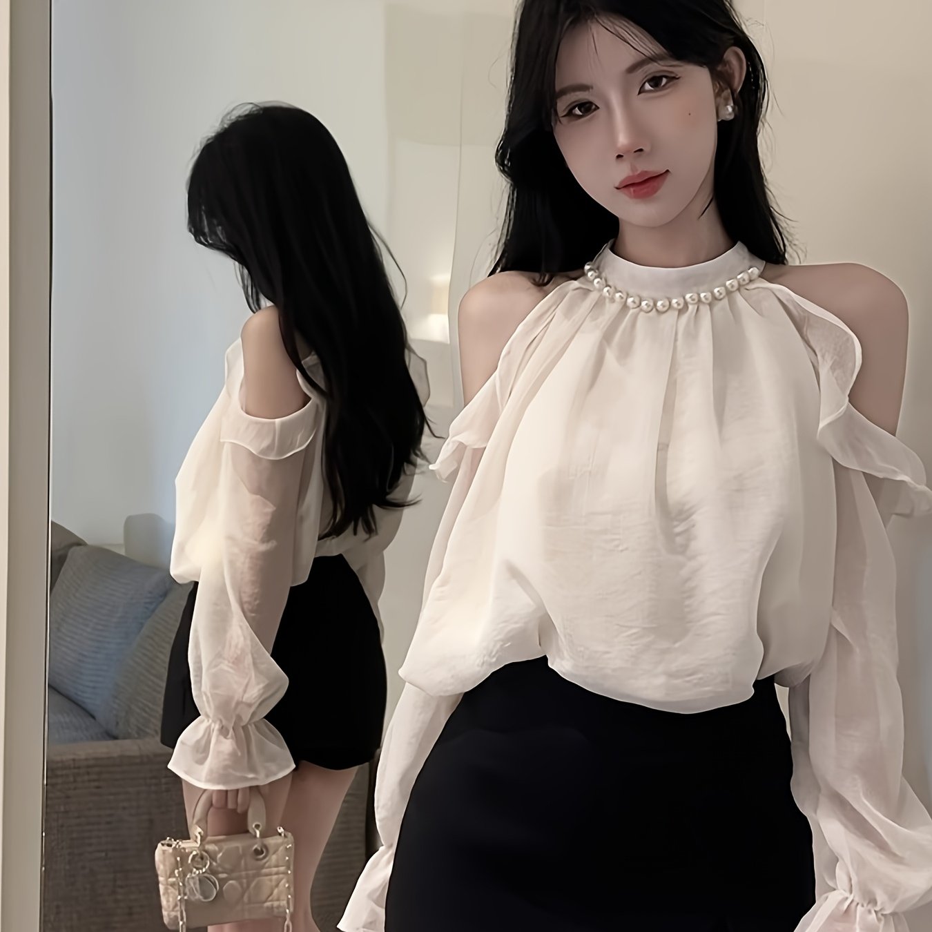 TEMU 여성용 시크한 긴팔 홀터 쉬폰 블라우스, 2025년 봄을 위한 우아한 셔츠, 스타일리시한 오프숄더 탑|블라우스|여름블라우스|여성블라우스