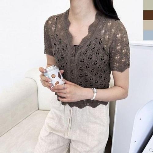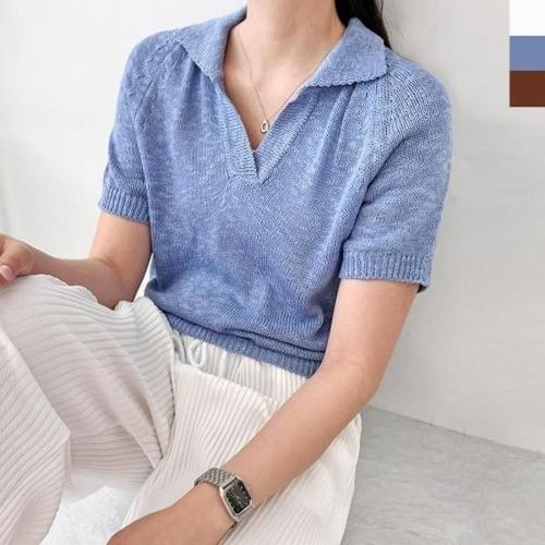 [엄지척]여성 시원한 오픈 카라 반팔 니트티 데일리룩 코디룩_19680986_667501
