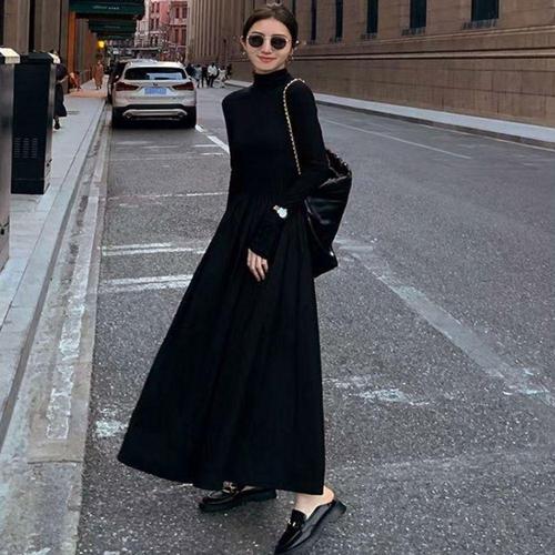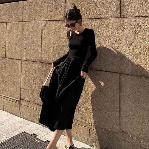 [셀럽하우스]올블랙 QOHY0449 페이크 2중 펀칭 A라인 여성 롱 시크 원피스