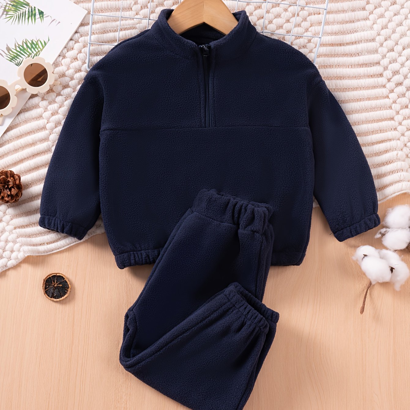 TEMU 가을 겨울 남아용 따뜻한 세트: 스타일리시 솔리드 컬러 하프 지퍼 플리스 후디 & 팬츠 투피스, 일상 및 야외 활동에 완벽