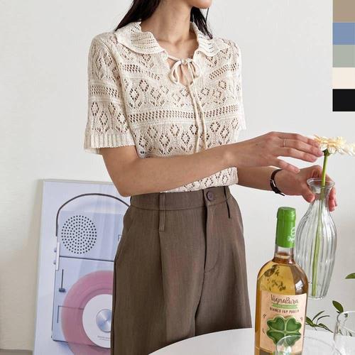 [에이치플러스몰]스카시반팔 카라리본 캐주얼 니트 티셔츠 필수템