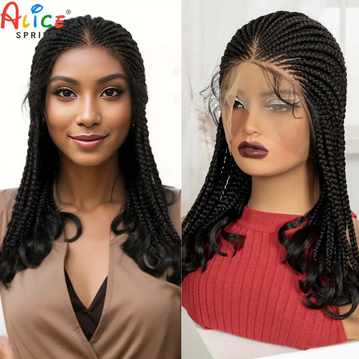 18인치 웨이브 끝 끈 땋은 가발, 합성 풀 레이스 땋은 레이스 가발 (베이비 헤어 포함), 흑인 여성용 매듭 없는 땋은 가발