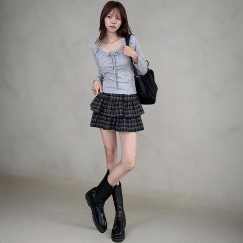 [옷자락]여성 심플 리본 스트랩 컷팅 셔링 블라우스