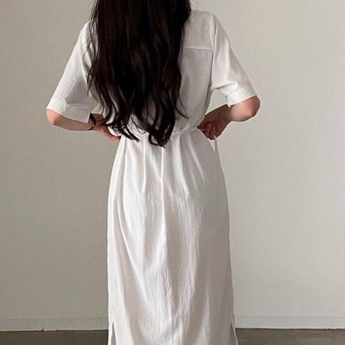 [옷자락] 여성 심플 카라넥 단추 허리끈 트임 반팔 롱 원피스