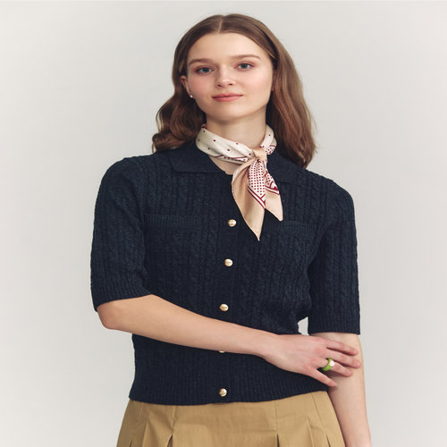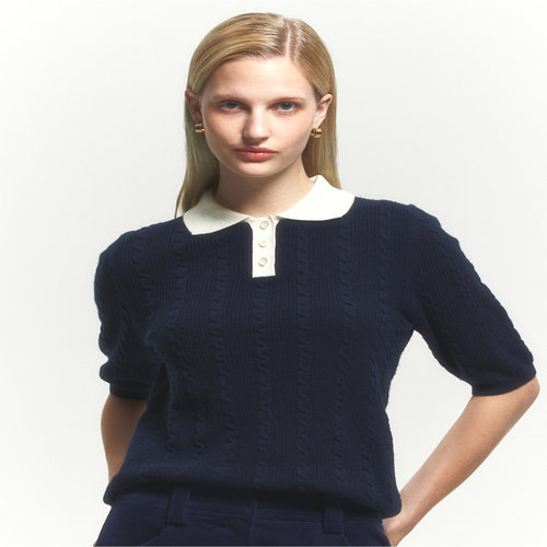 헤지스 여성 [클리어런스][울] 네이비 베이비 케이블 반소매 배색 카라 스웨터 (HSSW4CC74N2)