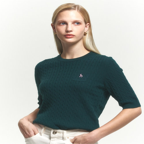 헤지스 여성 [클리어런스][울100] 다크그린 베이비 케이블 라운드넥 반소매 스웨터 (HSSW4CC73E3)