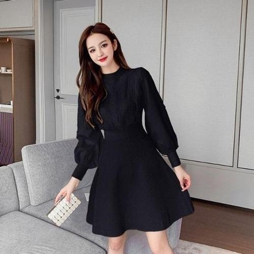 [엄지척]레이스 자수 니트 볼륨소매 A라인 골지 스커트 원피스_19871806_667501