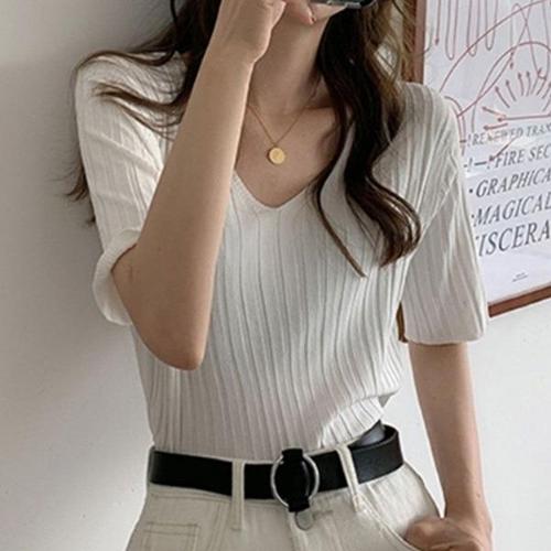 [엄지척]브이넥 골지 니트 티셔츠 반팔티 무지 데일리 4컬러_19611133_667501