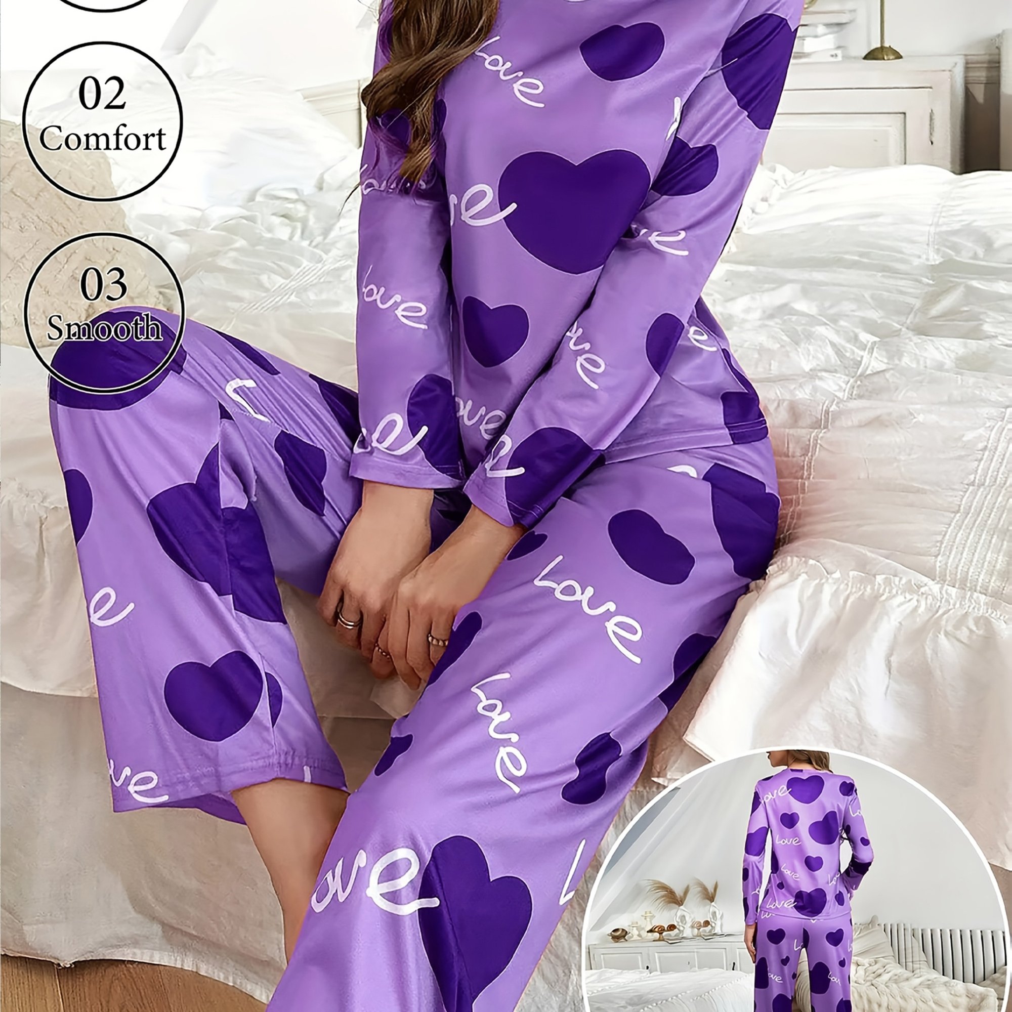 TEMU 발렌타인데이 여성용 하트 및 슬로건 프린트 긴팔 잠옷 세트 | 편안한 원단, 루즈핏, 크루넥, 긴 바지, 탄성 허리 밴드, 슬립오버 스타일