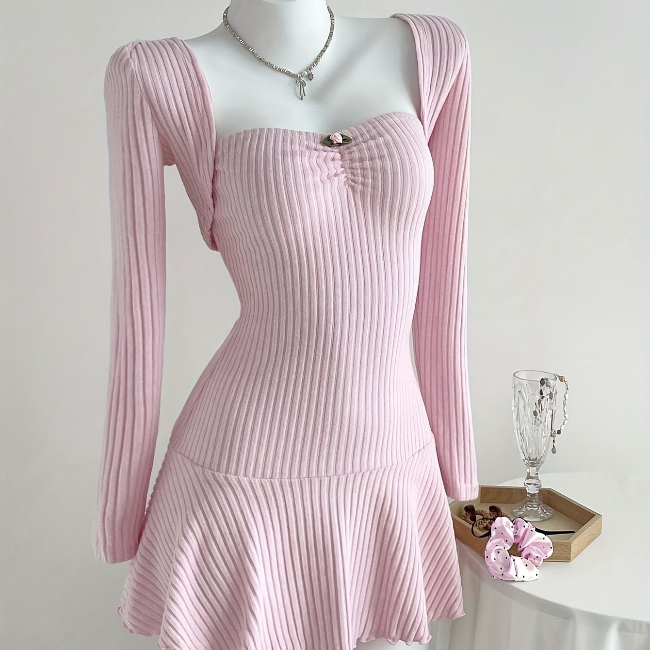 TEMU 여성용 가을/겨울 패션 세트 2개: 소프트 리브드 긴팔 탑과 플리츠 허리 드레스, 외출 및 파티용