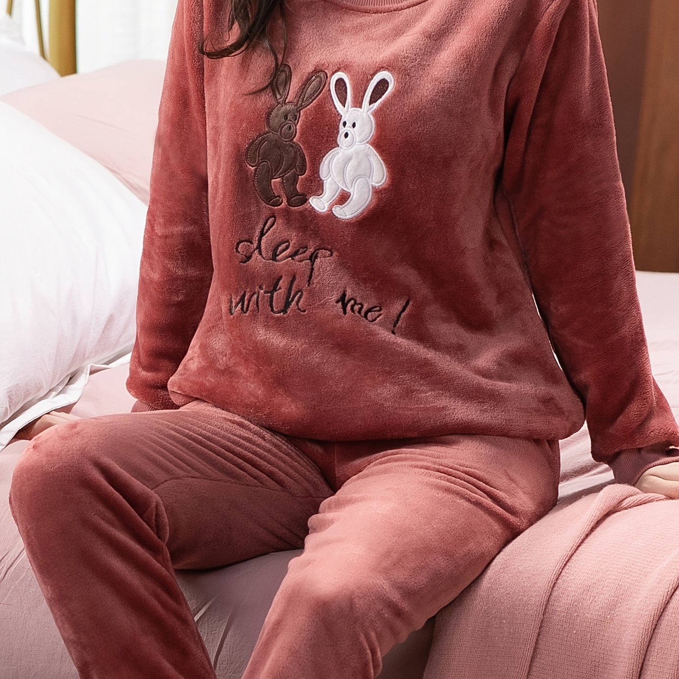 TEMU 여성용 가을/겨울 플란넬 세트 - 긴팔 라운드넥 탑과 탄력성 있는 허리밴드 조거 팬츠, 리브드 커프로 보온, 패셔너블 카툰 레터 자수, 두꺼운 플러시 안감 겨울용
