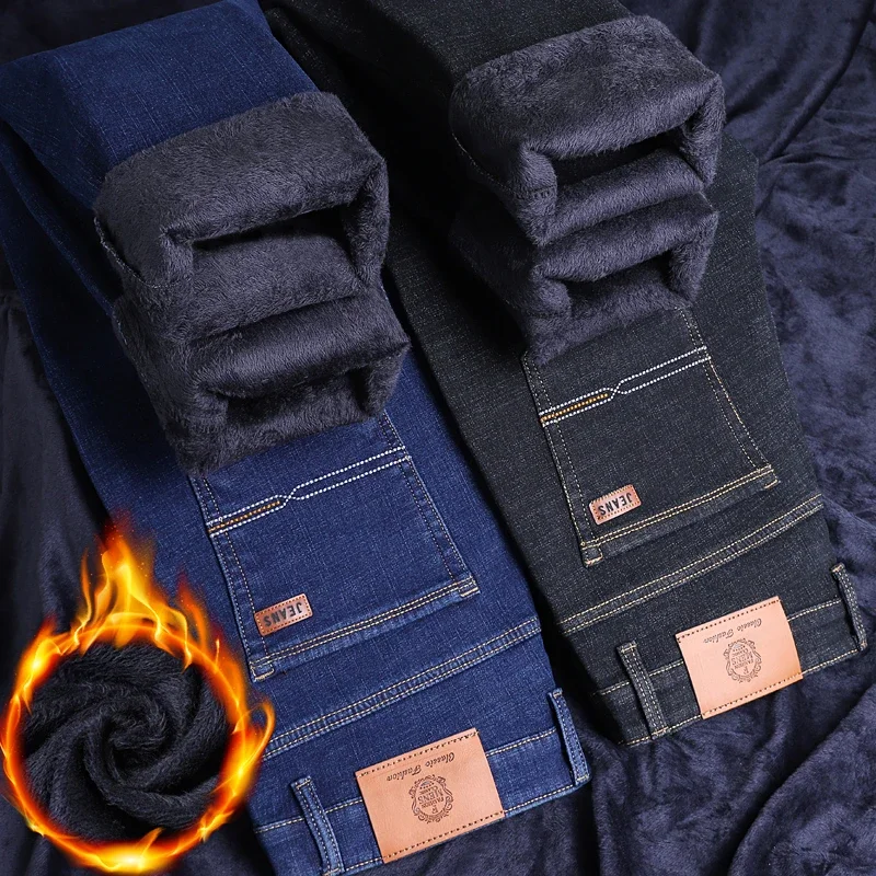 새로운 겨울 남성 양털 따뜻한 청바지 클래식 스타일 비즈니스 캐주얼 두꺼운 벨벳 슬림 데님 바지 브랜드 바지 남성 사이즈 28-42