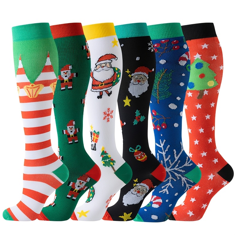 TEMU 여성 및 남성을 위한 6켤레의 축제 크리스마스 압박 양말 - 산타, 눈꽃, 장식이 있는 축제 휴일 디자인, 세탁기 사용 가능한 폴리에스터 혼방, 휴일 축하에 완벽한 크리스마스 양말