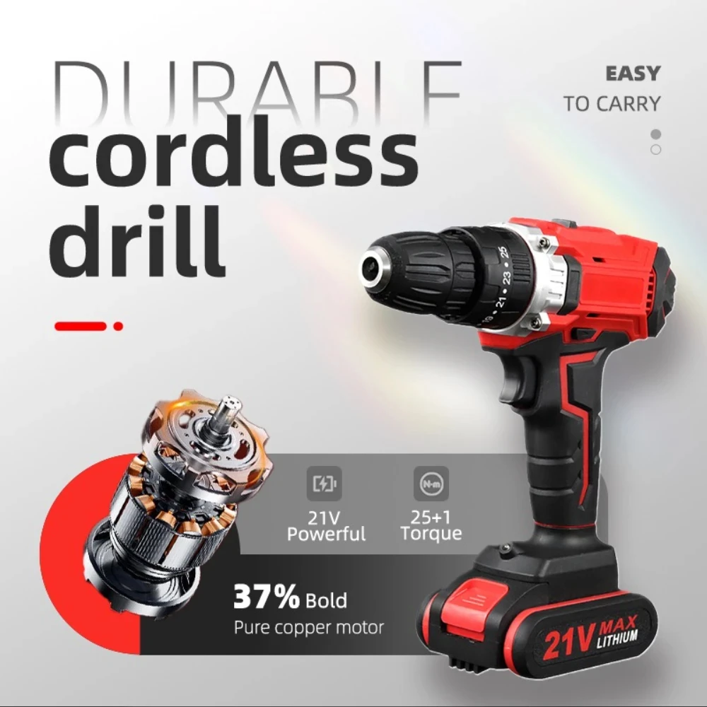 21V 다기능 무선 전기 드릴, 25가지 기어 모드 및 목공, 드릴링용 리튬 배터리 포함