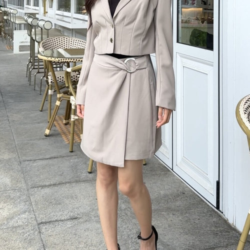 클루이가넷 / 가을 긴팔 핀턱 크롭 자켓 랩 버클 스커트 세트 지퍼 상하의안감 패드