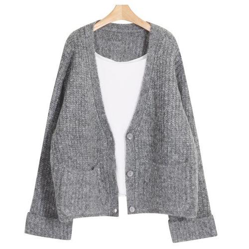 [샵앤]알파카 여성 단추Y오픈 루즈핏 세미크롭 울 긴팔 니트 가디건 FR.B-WCD-1663-차콜