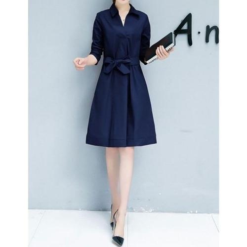 [엄지척]여성 여름 간절기 허리 리본 얇은 카라 미디 원피스_19861760_667501