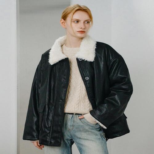 [나인식스뉴욕]카라 소매 양털 하프 집업 레더 자켓 (NP4JK022L0)