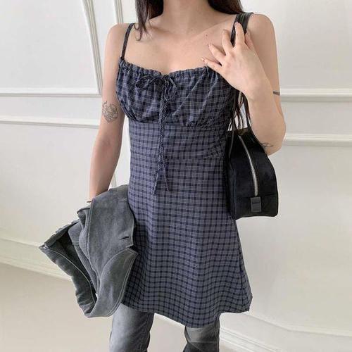 [신상오픈런]여성 체크 셔링 어깨끈 미니 드레스