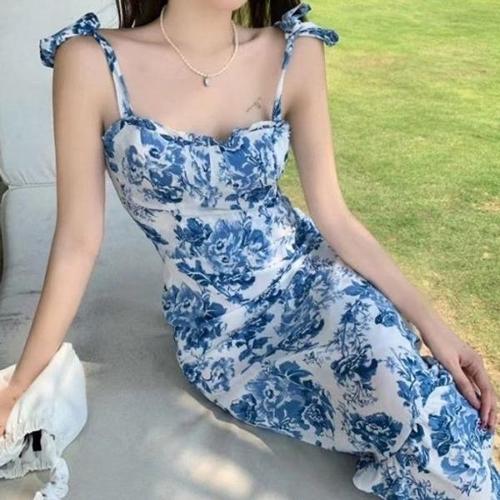 여성스런 원피스 플라워패턴 여행룩 어깨끈 비치웨어