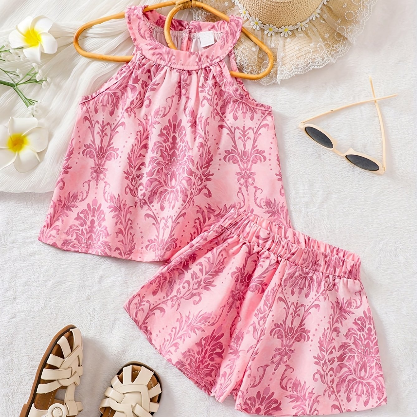 TEMU 여아용 귀여운 홀터 넥 목의 목이 없는 상의와 반바지 세트, 편안하고 패션적인 여름 의상, 일상적인 외출에 적합, 야외 활동에 완벽