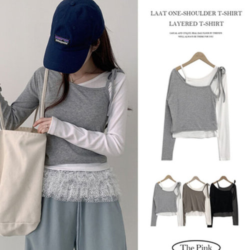 더핑크 / 라엣 슬림핏 원숄더 리본 트임 언발 레이어드 긴팔티