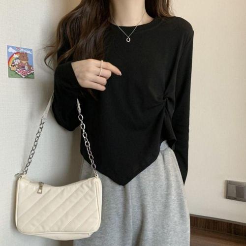 [신상오픈런]여성 간결 레이온 신축성 언발란스 슬림핏 롱슬리브 티셔츠