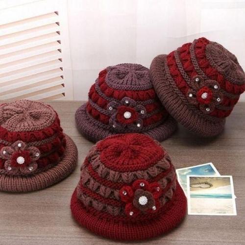 [에이치플러스몰]꽃장식 기모 중년 엄마 할머니 니트 벙거지 겨울 방한 모자