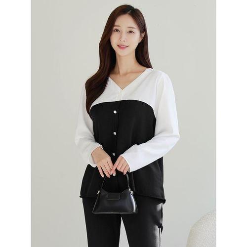 [드리다]여성 브이넥 배색 빅사이즈 긴팔 블라우스 하객 모임 상견례 오피스룩 미시 엄마옷