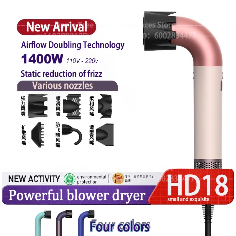 HD18New 헤어드라이어, 1400W 고출력, 빠른 건조, 가벼운 본체, 저소음, 다양한 종류의 에어 노즐이 함께 제공됩니다.