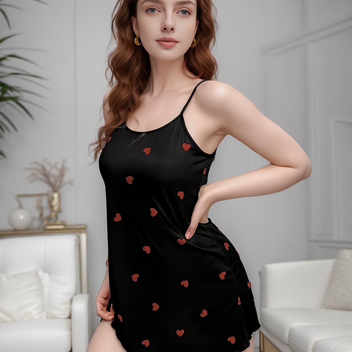 TEMU 여성용 블랙 하트 프린트 캐미 나이트가운 - 조절 가능한 스파게티 스트랩이 있는 캐주얼 민소매 잠옷, 사계절 편안함을 위한 가벼운 폴리에스터, 집이나 휴식에 완벽한, 편안한 핏 드레스 | 하트 패턴 드레스 | 가벼운 원단
