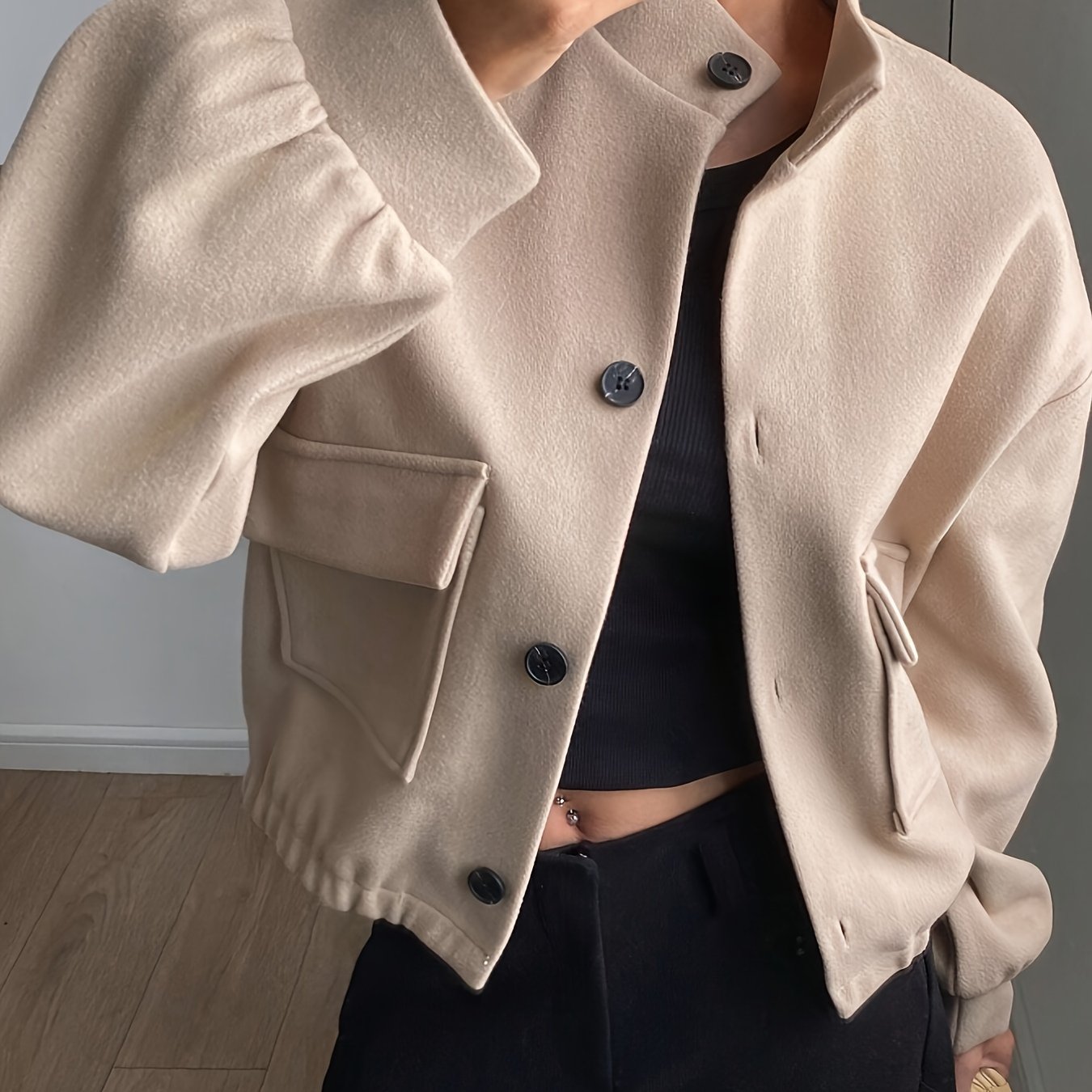 TEMU 여성용 포켓이 있는 편안한 베이지 보머 재킷 - 캐주얼 긴팔, 단추업, 가을/겨울용 스탠드 칼라, 캐주얼 의상에 완벽, 가을 겨울 재킷 | 스탠드 칼라 재킷 | 단추업 재킷